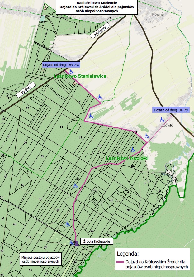 W wyniku konsultacji wprowadzanych ostatnio zmian organizacyjnych w zakresie funkcjonowania ścieżki dydaktycznej „Królewskie Źródła”, a także mając na uwadze konieczność zapobiegania zagrożeniom wypadkowym, oraz wychodząc naprzeciw potrzebom osób ze specjalnymi potrzebami, Nadleśnictwo Kozienice wyznaczyło alternatywny dojazd do polany piknikowej na ścieżce dydaktycznej „Królewskie Źródła”, wyłącznie dla osób posiadających pojazdy przystosowane dla potrzeb niepełnosprawnych ( legitymujących się posiadaniem stosownych uprawnień). Dojazd prowadzi od drogi wojewódzkiej 737 w kierunku miejscowości Nowiny/Kociołki, a następnie wjazd do lasu w oddz. 10 Leśnictwa Kociołki i dalej leśną drogą gruntową aż do „Królewskich Źródeł”.